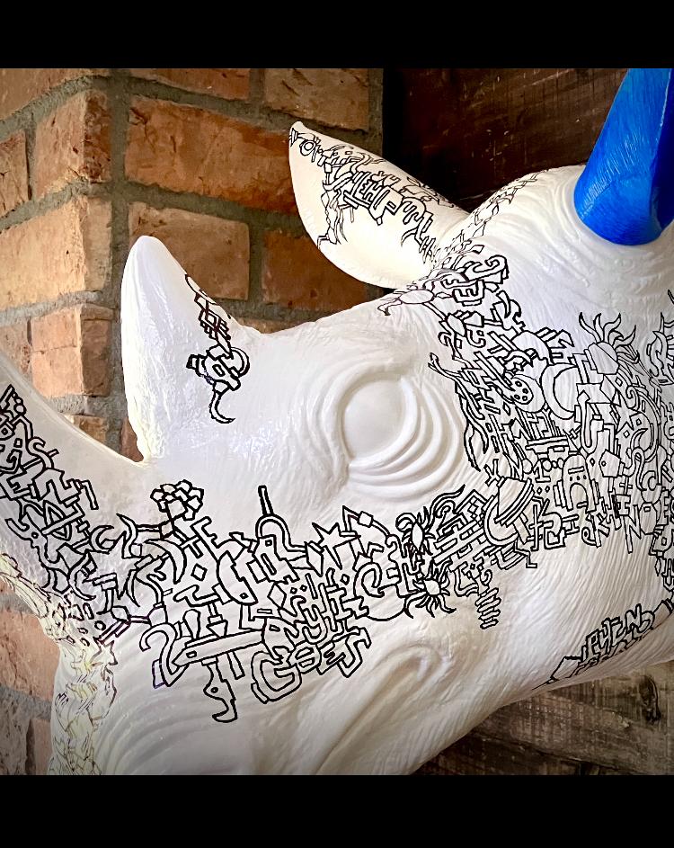 線は重なり、曲がり、交わりながら、内側の記憶へとつながっていきます。標識や郵便ポスト、森で見つけた小人の痕跡、怖がりな白黒の愛犬。脈絡も目的もありません。
